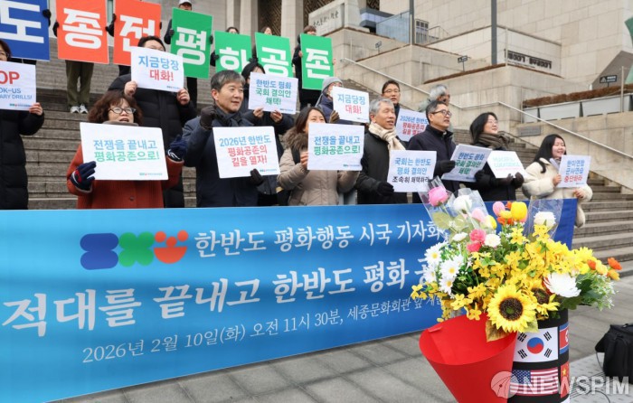 [서울=뉴스핌] 양윤모 기자 = 한반도 평화행동 회원들이 10일 오전 서울 종로구 세종문화회관 계단에서 '2026년, 적대를 끝내고 한반도 평화 공존의 길을 열자' 행사를 개최 했다. 행사 참석자들은 한반도 평화 공존의 출발점은 적대와 한국전쟁 종식이며,상호 군사위협 중단,상대체제 존중에 기초한 관계개선의 필요성을 강조했다. 2026.02.10 yym58@newspim.com