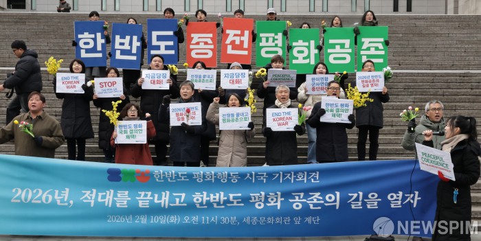 [서울=뉴스핌] 양윤모 기자 = 한반도 평화행동 회원들이 10일 오전 서울 종로구 세종문화회관 계단에서 '2026년, 적대를 끝내고 한반도 평화 공존의 길을 열자' 행사를 개최 했다. 행사 참석자들은 한반도 평화 공존의 출발점은 적대와 한국전쟁 종식이며,상호 군사위협 중단,상대체제 존중에 기초한 관계개선의 필요성을 강조했다. 2026.02.10 yym58@newspim.com