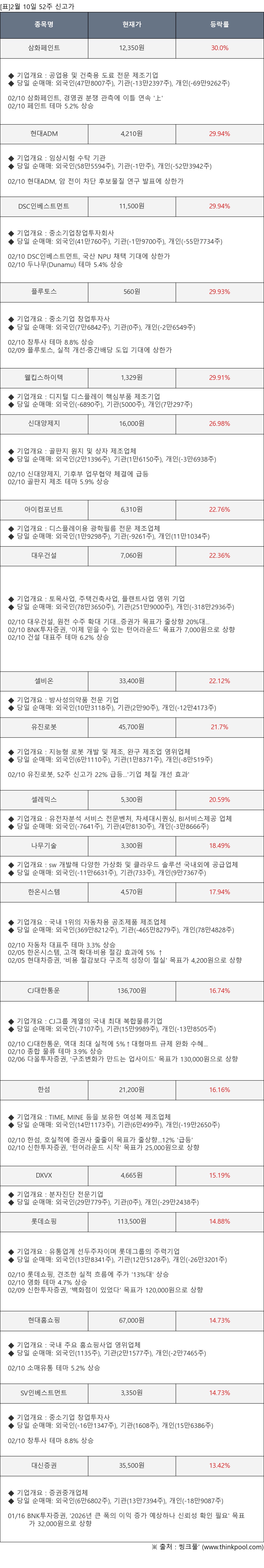 [서울=뉴스핌] 로보뉴스 = 2월 10일, 인공지능 투자비서 ‘AI라씨로’가 52주 신고가가 발생한 삼화페인트(000390), 현대ADM(187660) 등에 대해 최근 동향을 분석했다.
