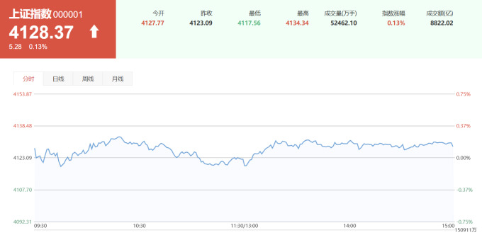 이날 상하이종합지수는 0.13% 상승한 4128.37, 선전성분지수는 0.01% 상승한 14210.63, 촹예반지수는 0.37% 하락한 3320.54로 장을 각각 마감했다.