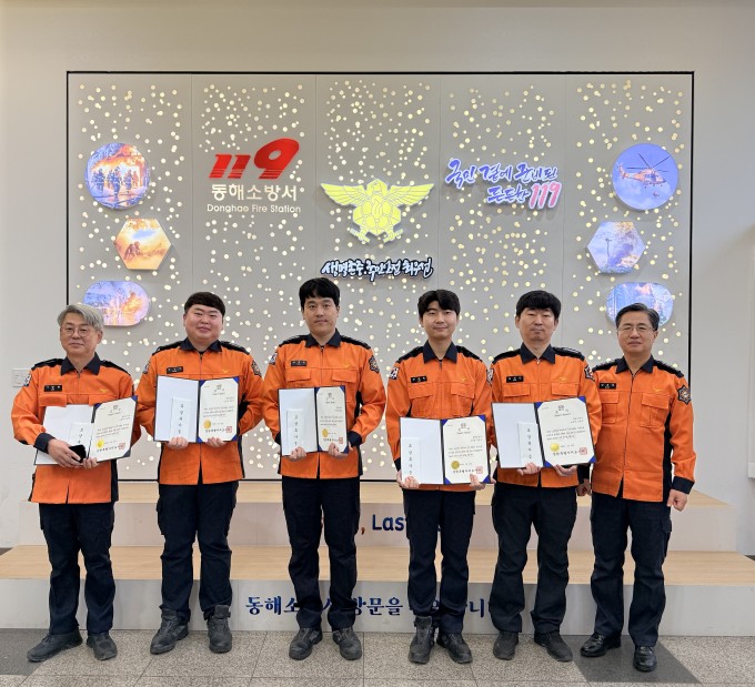 [동해=뉴스핌] 이형섭 기자 = 강원 동해소방서는 10일 서장실에서 '2026년 상반기 으뜸소방관' 선정과 하트세이버(Heart Saver) 증서 수여식을 열고, 현장에서 헌신한 직원들을 격려했다.