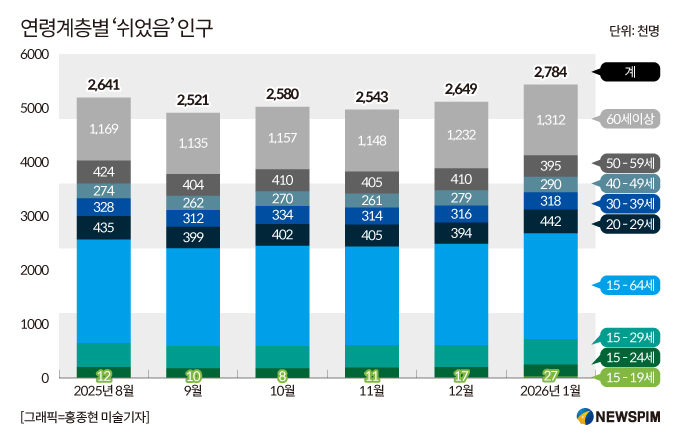 [세종=뉴스핌] 신수용 기자 = 경제활동에 참여하지 않고 '그냥 쉬었다'고 답한 인구가 278만4000명으로 통계 작성 이래 최대치를 기록했다. 특히 청년층 '쉬었음' 인구가 46만9000명으로 5년 만에 최고 수준으로 늘었고, 청년 실업률도 6.8%로 상승하는 등 2030 고용지표가 뚜렷하게 악화된 것으로 나타났다.