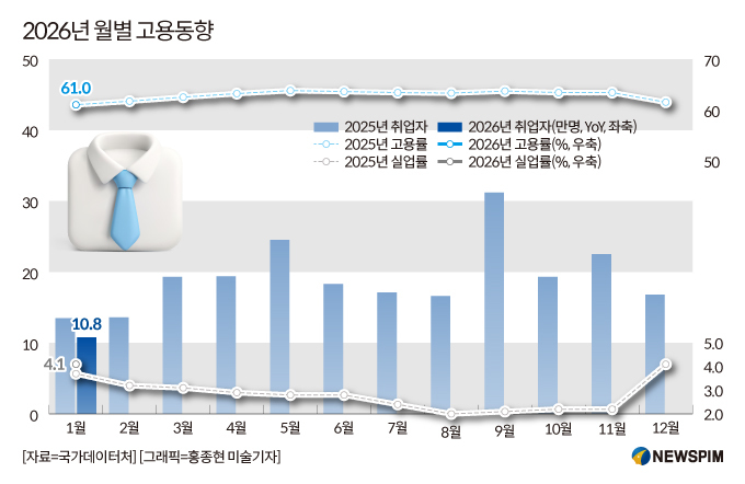 빈 국장은 "1월 조사 기간에 한파가 이어져 지자체별로 노인일자리 사업 시기를 탄력적으로 늦추며 고령층이 높게 잡혔고, 청년층도 고용 여건 악화로 구직과 대기 상태가 길어지고 있다"며 "전문·과학·기술서비스업 등 일부 분야에서는 인공지능(AI) 활용 확대가 일부 업무를 대체하면서 신규 채용이 둔화된 영향도 일부 있는 것으로 보인다"고 분석했다.
