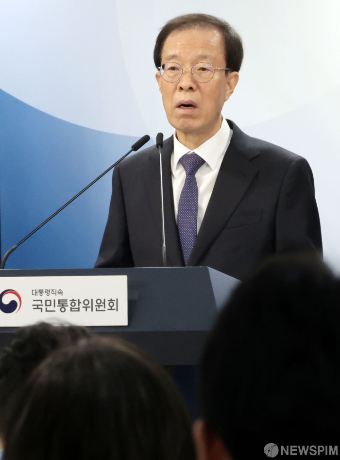 [서울=뉴스핌] 이길동 기자 = 이석연 국민통합위원회 위원장이 11일 서울 종로구 정부서울청사에서 국민통합을 위한 5대 사회갈등 국민인식조사 결과를 브리핑하고 있다.2026.02.11 gdlee@newspim.com