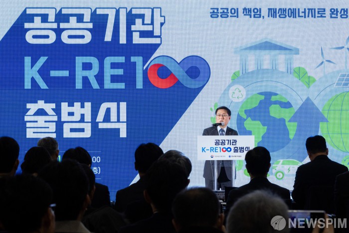 [서울=뉴스핌]김성환 기후에너지환경부 장관이 11일 서울 서초구 소재 한전아트센터에서 열린 ‘공공기관 K-RE100 출범식’에 참석하여 환영사를 하고 있다.[사진= 기후에너지환경부] 2026.02.11 photo@newspim.com
