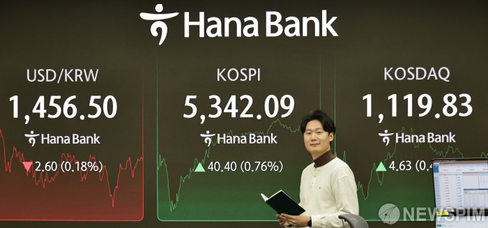 [서울=뉴스핌] 양윤모 기자= 11일 오후 코스피가 전장 종가보다 40.40 포인트(0.76%) 상승하며 5342.09 로, 코스닥은 4.63 포인트(0.42%) 상승한 1119.83 로 거래되는 가운데, 서울 중구 하나은행본점 딜링룸에서 직원들이 업무를 보고 있다. 서울외환시장에서 달러/원 환율은 전장 대비 2.60원 하락한 1456.50원에 거래되고 있다. 2026.02.11 yym58@newspim.com