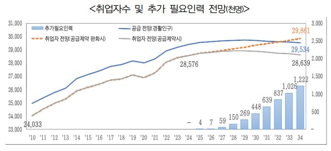 향후 10년간 지속적인 경제 성장을 하기 위해서는 현재 예상되는 노동 공급 규모보다 더 많은 인력이 필요하다는 설명이다. 이 같은 추가 필요 인력은 2029년 26만9000명에서 2034년 122만2000명으로 늘어난다.