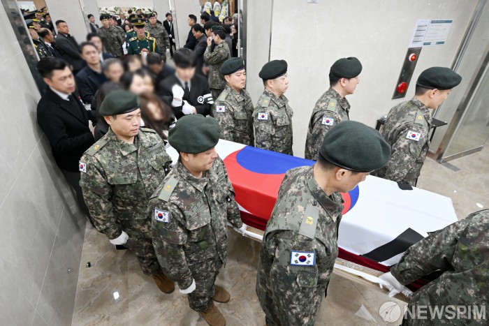 [성남=뉴스핌] 사진공동취재단 = 12일 오전 경기 성남시 분당구 국군수도병원 장례식장에서 코브라 헬기 추락으로 순직한 고(故) 장희성‧정상근 준위 영결식이 엄수되고 있다. 2026.02.12 photo@newspim.com