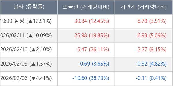 [서울=뉴스핌] 로보뉴스 = 12일 10시 15분 현재 화신(010690)은 외국인과 기관이 각각 30.84 만 주, 8.70 만 주 순매수(잠정) 하면서 전일 대비 12.51% (현재가 11,420원) 상승하고 있다.