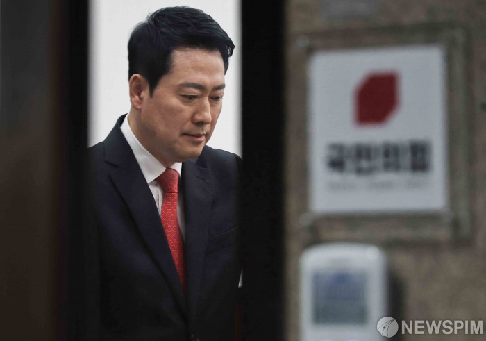 [서울=뉴스핌] 윤창빈 기자 = 장동혁 국민의힘 대표가 12일 오전 서울 여의도 국회에서 이재명 대통령과의 오찬 불참 관련 기자회견을 위해 이동 전 잠시 대기하고 있다. 2026.02.12 pangbin@newspim.com