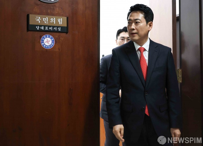 [서울=뉴스핌] 윤창빈 기자 = 장동혁 국민의힘 대표가 12일 오전 서울 여의도 국회에서 이재명 대통령과의 오찬 불참 관련 기자회견을 위해 이동하고 있다. 2026.02.12 pangbin@newspim.com