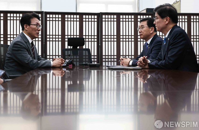 [서울=뉴스핌] 윤창빈 기자 = 김민석 국무총리(왼쪽)가 12일 오전 서울 여의도 국회에서 행정통합 의결을 앞두고 신정훈 국회 행정안전위원장과 회동하고 있다. 2026.02.12 pangbin@newspim.com