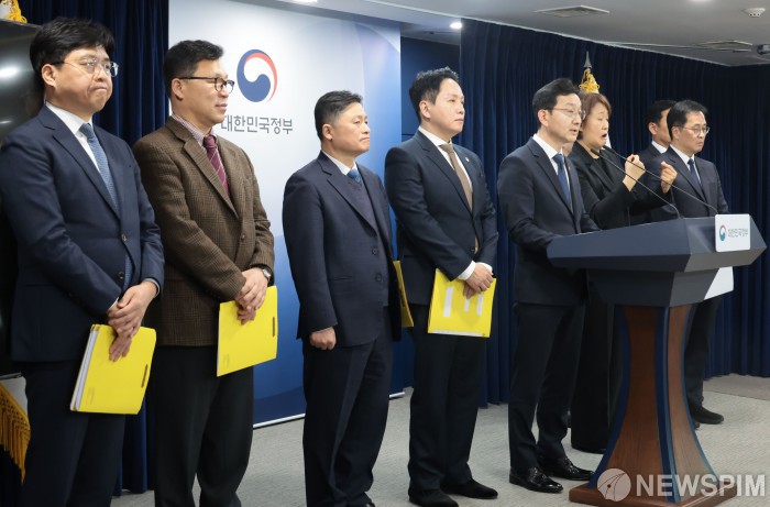 [서울=뉴스핌] 이길동 기자 = 윤창렬 국무조정실장(왼쪽에서 다섯번째)이 12일 서울 종로구 정부서울청사에서 '헌법존중 정부혁신 TF' 조사결과를 발표하고 있다.2026.02.12 gdlee@newspim.com