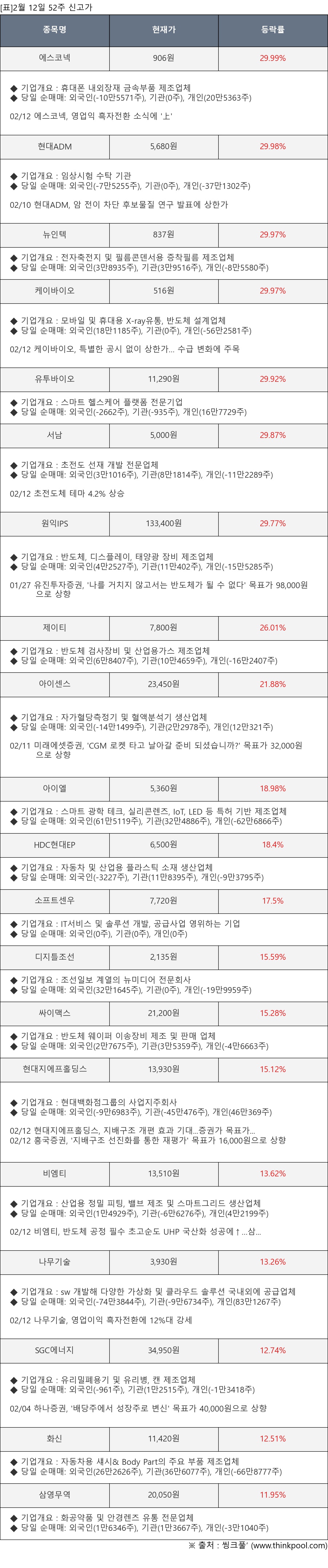 [서울=뉴스핌] 로보뉴스 = 2월 12일, 인공지능 투자비서 ‘AI라씨로’가 에스코넥(096630), 현대ADM(187660) 등 52주 신고가가 발생한 종목들에 대한 최근 동향을 분석했다.