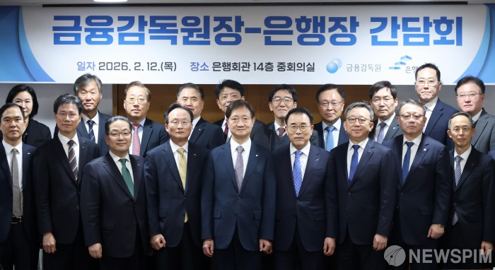 [서울=뉴스핌] 정일구 기자 = 이찬진 금융감독원장이 12일 오후 서울 중구 은행회관에서 열린 금융감독원장-은행장 간담회에서 조용병 은행연합회 회장을 비롯한 국내은행 은행장들과 기념촬영을 하고 있다. 2026.02.12 mironj19@newspim.com