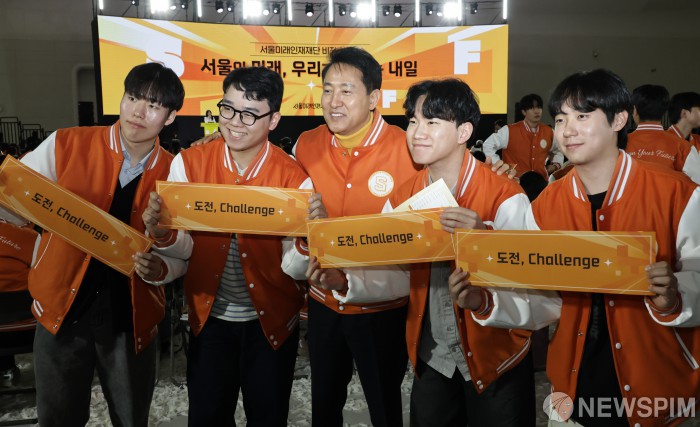 [서울=뉴스핌] 양윤모 기자 = 오세훈 서울시장이 12일 오후 서울 동대문디자인플라자(DDP) 아트홀에서 개최된 '서울미래인재재단 비전선포식' 행사에 참석해 인증샷 촬영을 하고 있다. 2026.02.12 yym58@newspim.com