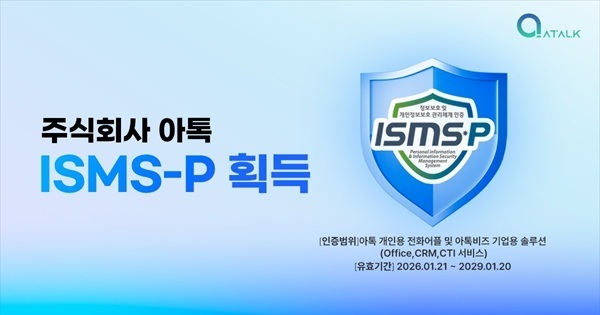[서울=뉴스핌] 오경진 기자 = 주식회사 아톡(대표 주웅대)이 금융보안원으로부터 국가 공인 정보보호 및 개인정보보호 관리체계(ISMS-P) 인증을 획득했다고 13일 밝혔다.