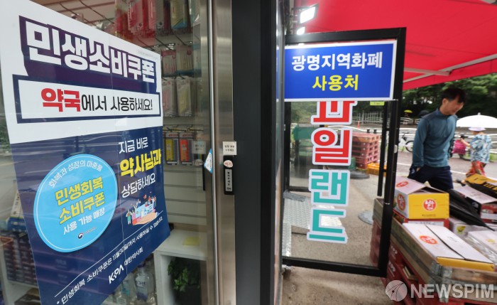 [광명=뉴스핌] 김학선 기자 = 18일 경기도 광명시의 한 약국에 민생회복 소비쿠폰 사용처 안내문이 붙어 있다. 2025.07.18 yooksa@newspim.com
