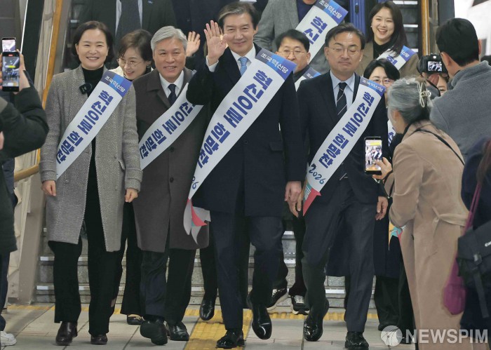 [서울=뉴스핌] 윤창빈 기자 = 조국 조국혁신당 대표가 13일 오전 서울 용산구 용산역에서 시민들에 설 귀성인사를 하고 있다. 2026.02.13 pangbin@newspim.com