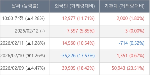 [서울=뉴스핌] 로보뉴스 = 13일 10시 15분 현재 코리아에프티(123410)는 외국인과 기관이 각각 1.30 만 주, 0.20 만 주 순매수(잠정) 하면서 전일 대비 4.28% (현재가 8,280원) 상승하고 있다.