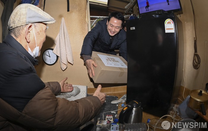 [서울=뉴스핌] 정일구 기자 = 약자와의동행위원회 설맞이 봉사활동에 나선 장동혁 국민의힘 대표가 13일 오전 서울 중구 쪽방촌을 찾아 주민에게 설 맞이 온정 보따리를 전달하고 있다. 2026.02.13 mironj19@newspim.com