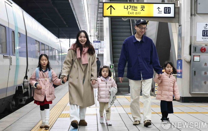 [서울=뉴스핌] 윤창빈 기자 = 설 연휴를 앞둔 13일 오전 서울 용산구 용산역에서 한 가족들이 고향길 대신 여행길에 오르고 있다. 2026.02.13 pangbin@newspim.com