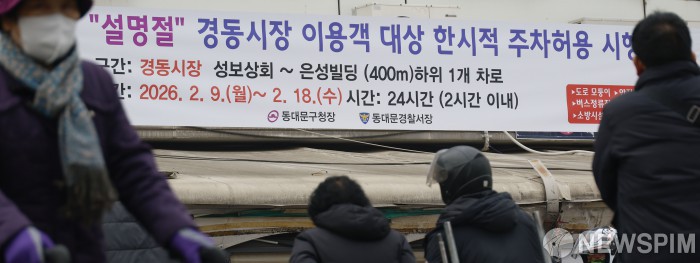 [서울=뉴스핌] 류기찬 기자 = 설 연휴를 사흘 앞둔 13일 오전 서울 동대문구 경동시장에 한시적 주차허용 안내 현수막이 붙어있다. 2026.02.13 ryuchan0925@newspim.com