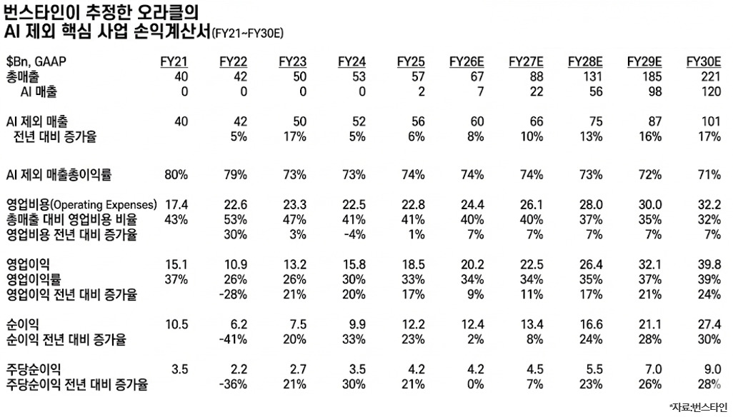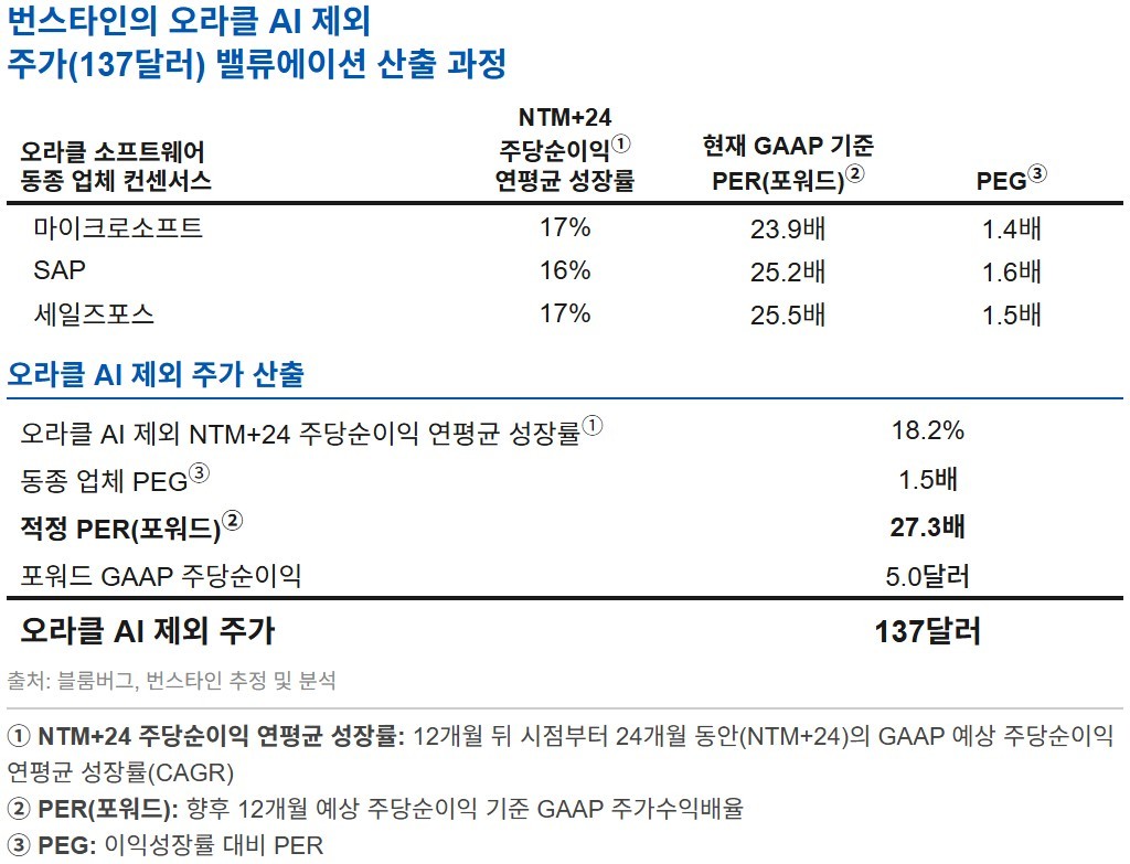 번스타인은 주가 137달러의 산출 근거도 보고서에 구체적으로 제시했다. AI 매출을 전량 제거하고 전통 데이터베이스·SaaS·OCI만으로 구성한 핵심 사업 모델을 별도로 구축했다.