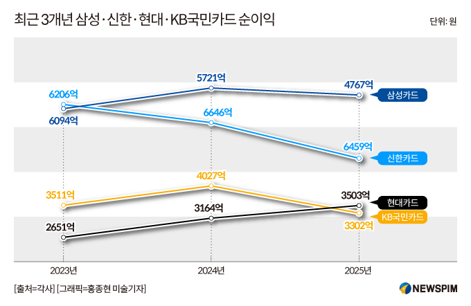 [그래픽] 최근 3개년 삼성·신한·현대·KB국민카드 순이익
