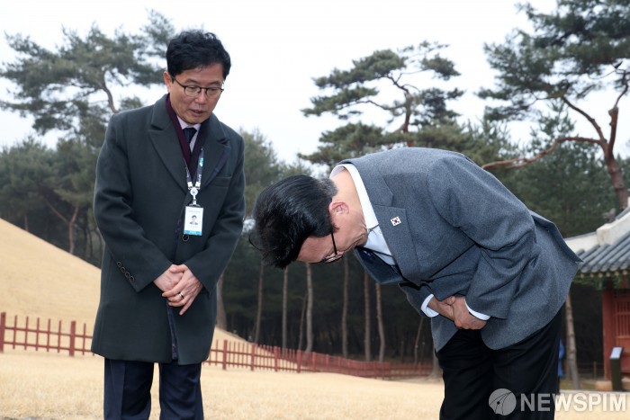 [서울=뉴스핌] 정일구 기자 = 김민석 국무총리가 13일 오후 서울 노원구 강릉을 방문해 1.29 도심주택공급방안 관련 태릉CC 현장점검에 앞서 예를 올리고 있다. 2026.02.13 mironj19@newspim.com