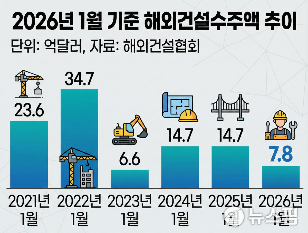 2023년 1월(6억6000만달러) 이후 3년 만에 가장 낮은 실적이다. 최근 5년간(2021~2025년)의 1월 평균 수주액인 18억9000만달러와 비교하면 41% 수준에 그쳐 평년작에도 한참 못 미치는 것으로 나타났다.