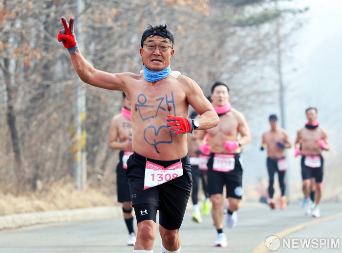 [서울=뉴스핌] 설 연휴 첫째 날인 14일 강원특별자치도 평창군 대관령면 대관령로 대관령눈꽃축제장에서 열린 ‘2026 평창 대관령 알몸 마라톤 대회’참가자들이 힘차게 달리고 있다. 이날 전국에서 모인 450여명의 마라톤 동호인들이 알몸 차림으로 5㎞, 10㎞코스를 달리며 대관령 한겨울의 추위를 즐겼다. [사진=평창관광문화재단] 2026.02.15 photo@newspim.com