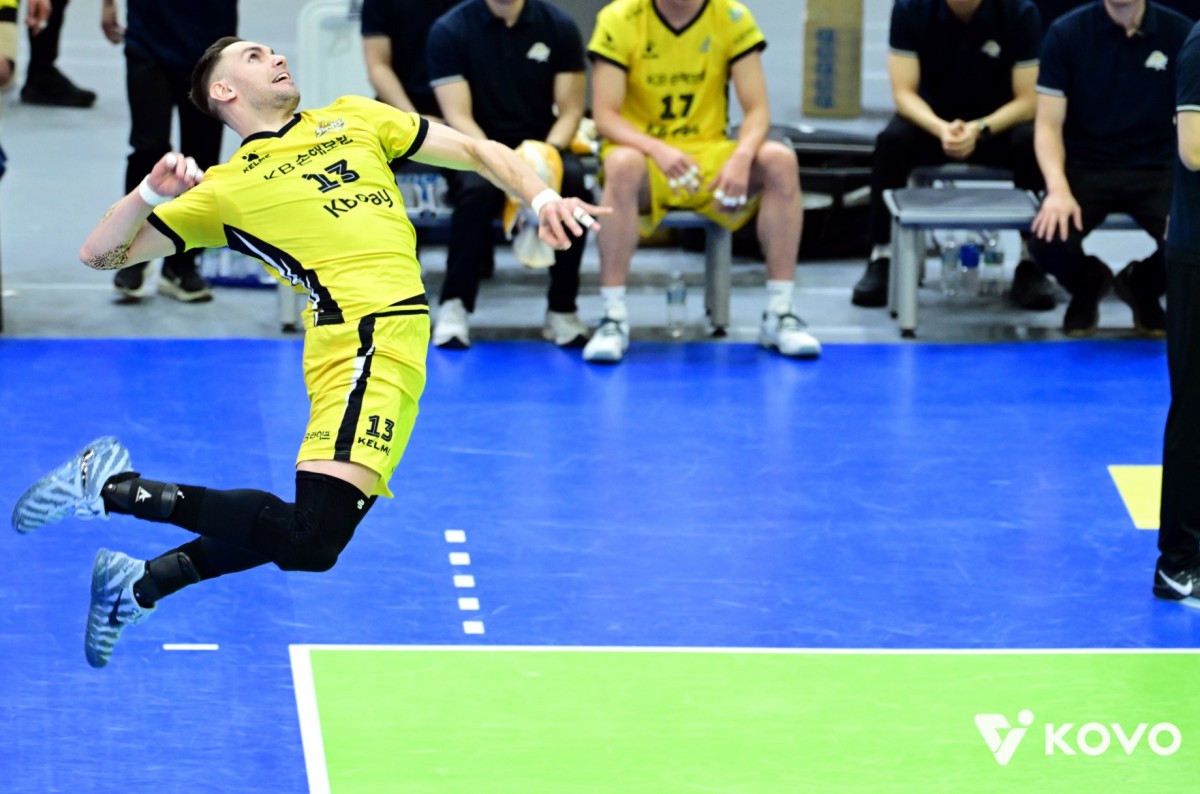 KB손해보험은 승점 3을 보태 승점 46(15승 14패)이 됐다. OK저축은행(승점 45) 한국전력(승점 43) 우리카드(승점 41)까지 4팀이 봄 배구를 두고 끝까지 경쟁하는 국면이다.