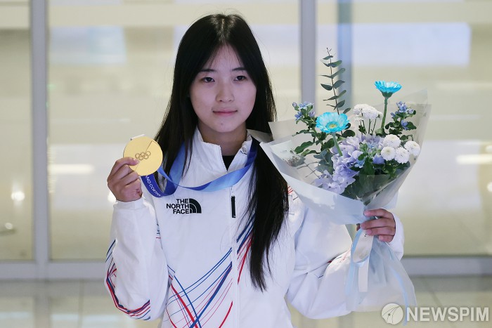 [영종도=뉴스핌] 이형석 기자 = 2026 밀라노·코르티나담페초 동계올림픽 스노보드 하프파이프 금메달리스트 최가온이 16일 오후 인천국제공항을 통해 귀국하며 포즈를 취하고 있다. 2026.02.16 leehs@newspim.com