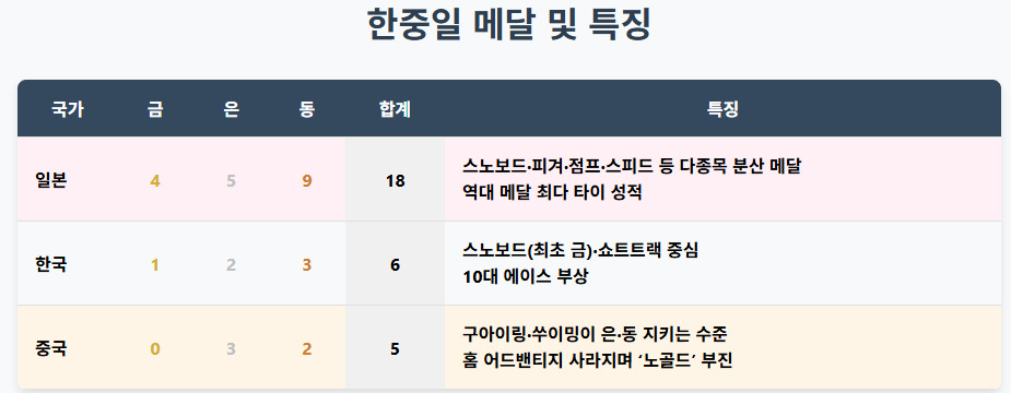 일본은 역대 최다 메달 신기록 경신을 눈앞에 두며 동계올림픽 종합 강국의 위상을 굳혔다. 한국은 스노보드와 쇼트트랙을 축으로 세대교체의 결실을 수확 중이다. 중국은 2022 베이징의 영광을 뒤로한 채 노골드 위기 속에서 반전을 모색하고 있다.