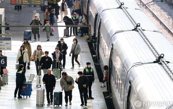 [서울=뉴스핌] 정일구 기자 = 설 연휴 마지막 날인 18일 오후 서울 용산구 서울역에서 귀경객들이 열차에서 내려 이동하고 있다. 2026.02.18 mironj19@newspim.com