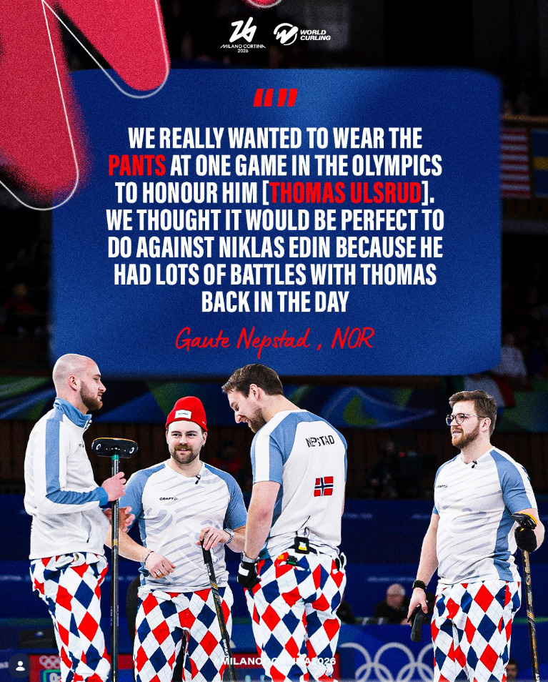 [코르티나담페초 로이터=뉴스핌] 알록달록한 바지를 입고 스웨덴과 경기를 펼친 이유를 밝힌 노르웨이 컬링 대표팀. [사진 = 월드 컬링 SNS] 2026.02.18 wcn05002@newspim.com