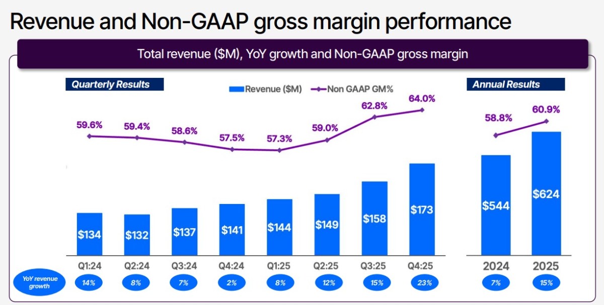수익성 지표도 개선됐다. 비일반회계원칙(Non-GAAP) 기준 총 마진은 64.0%로 예상치인 61.5%를 크게 상회했으며, 전년 동기 대비 650bp, 전분기 대비 120bp 개선되었다. 이는 2024년 4분기의 57.5%에서 크게 상승한 기록적인 수준이다. 잉여 현금 흐름은 860만 달러로 마진율 5%를 기록했으며, 이는 월가 컨센서스 예상치인 마이너스 1110만 달러를 훨씬 웃도는 성과다.