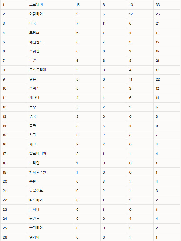 노르웨이는 금 15개, 은 8개, 동 10개로 금메달은 물론 메달 합계에서도 1위를 질주하고 있다. 개최국 이탈리아가 금 9개, 은 5개, 동 11개로 2위를 굳혀가고 있다. 일본은 금 5개, 은 6개, 동 11개로 9위에 올랐다.
