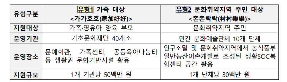 공모는 두 가지 유형으로 진행된다. 먼저 가족 대상 프로그램 '가가호호(家加好好)'는 기초문화재단 40곳이 지역 내 문화기반시설, 가족센터, 공동육아나눔터 등과 연계해 운영, 육아 스트레스 완화와 정서적 회복을 돕는 프로그램에 초점을 맞춘다.