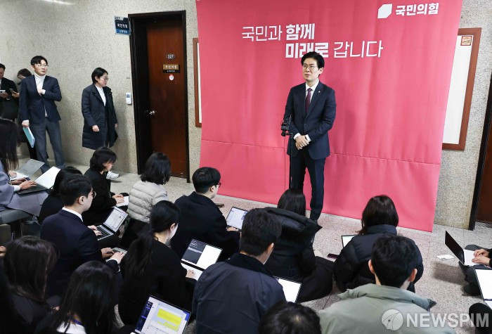[서울=뉴스핌] 윤창빈 기자 = 조정훈 국민의힘 인재영입위원회 위원장이 19일 서울 여의도 국회에서 인재영입위 3차 회의 결과를 브리핑 하고 있다. 2026.02.19 pangbin@newspim.com