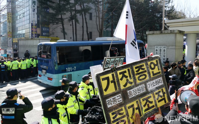 [서울=뉴스핌] 정일구 기자 = 내란 우두머리 혐의로 기소된 윤석열 전 대통령의 1심 선고기일인 19일 오후 서울 서초구 서울중앙지방법원에서 윤 전 대통령이 탄 호송차가 법원으로 들어서고 있다. 2026.02.19 mironj19@newspim.com