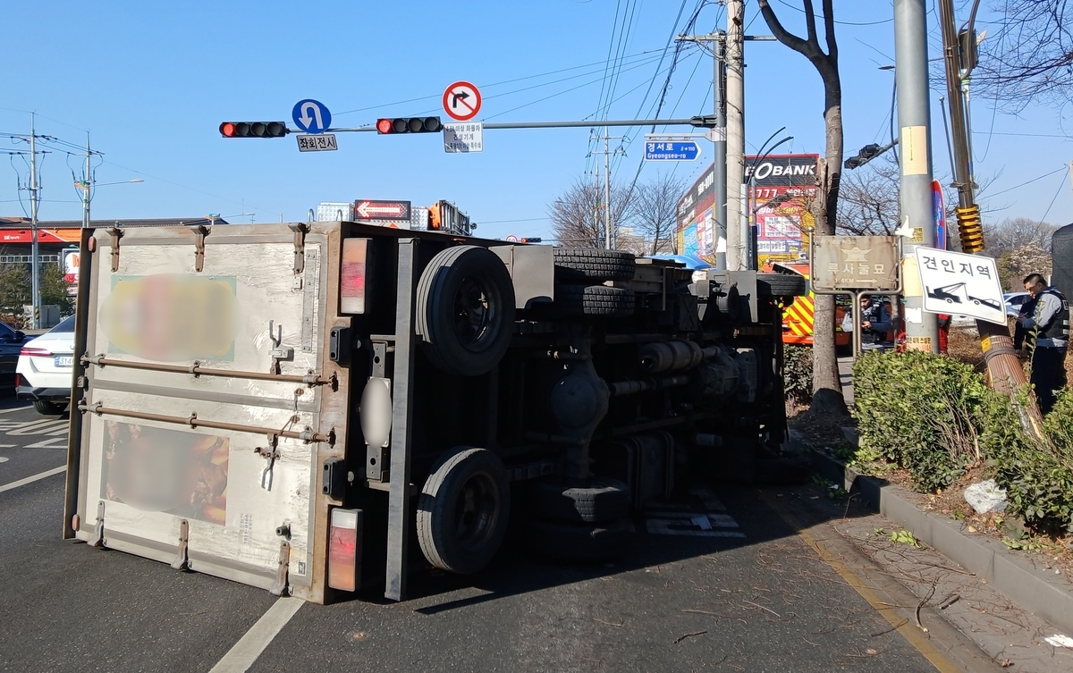 경찰에 따르면 이날 오전 10시 15분께 인천시 서구 경서동 도로에서 40대 A씨가 몰던 2.5t 화물차가 가로등을 들이받고 옆으로 넘어갔다.