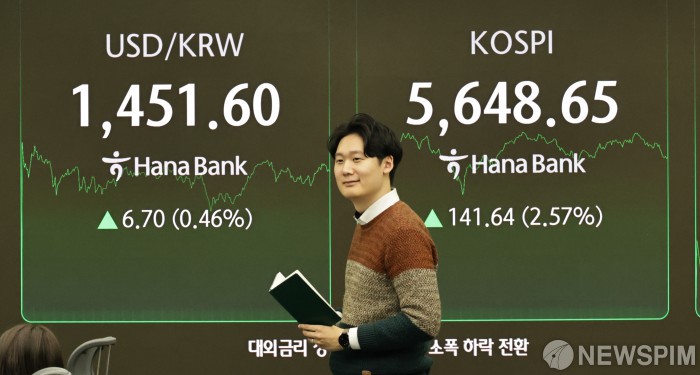 [서울=뉴스핌] 양윤모 기자= 19일 오후 코스피가 전장 종가보다 141.64 포인트(2.57%) 상승하며 5648.65 로, 코스닥은 48.74 포인트(4.41%) 상승한 1154.82로 거래되는 가운데, 서울 중구 하나은행본점 딜링룸에서 직원들이 업무를 보고 있다. 서울외환시장에서 달러/원 환율은 전장 대비 6.70원 상승한 1451.60원에 거래되고 있다. 2026.02.19 yym58@newspim.com