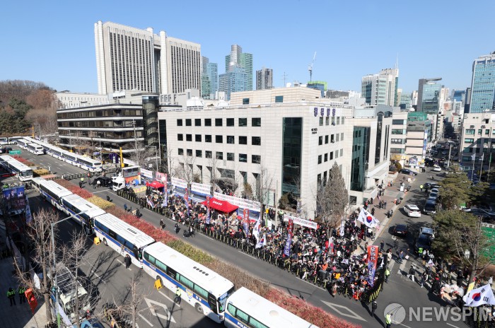 [서울=뉴스핌] 정일구 기자 = 윤석열 전 대통령의 내란 우두머리 혐의에 대한 1심 선고기일인 19일 오후 서울 서초구 서울중앙지방법원 입구가 경찰이 세운 차벽으로 통제된 가운데 윤 전 대통령 지지자들이 집회를 하고 있다. 2026.02.19 mironj19@newspim.com