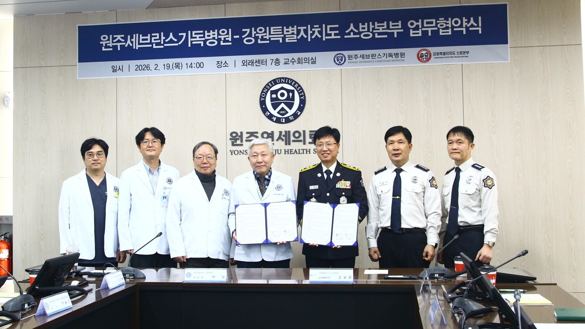 강원소방본부와 원주세브란스기독병원이 중증응급환자 이송 체계 구축과 도민 생명 보호를 위한 업무협약(MOU)을 체결했다.[사진=강원소방본부] ​2026.02.19 onemoregive@newspim.com