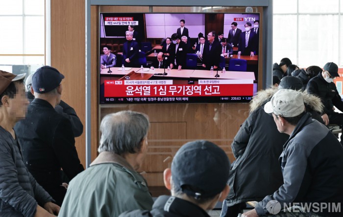 [서울=뉴스핌] 양윤모 기자 = 19일 오후 서울역을 찾은 시민들이 12·3 비상계엄 내란 우두머리 혐의로 기소된 윤석열 전 대통령의 1심 무기징역 선고방송을 시청하고 있다. 서울중앙지법 형사합의25부(지귀연 부장판사)는 이날 417호 대법정에서 윤 전 대통령의 내란 우두머리 혐의에 대해 444일만에 특검의 구형에 못미치는 무기징역을 선고했다. 2026.02.19 yym58@newspim.com
