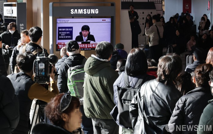[서울=뉴스핌] 양윤모 기자 = 19일 오후 서울역을 찾은 시민들이 12·3 비상계엄 내란 우두머리 혐의로 기소된 윤석열 전 대통령의 1심 무기징역 선고방송을 시청하고 있다. 서울중앙지법 형사합의25부(지귀연 부장판사)는 이날 417호 대법정에서 윤 전 대통령의 내란 우두머리 혐의에 대해 444일만에 특검의 구형에 못미치는 무기징역을 선고했다. 2026.02.19 yym58@newspim.com