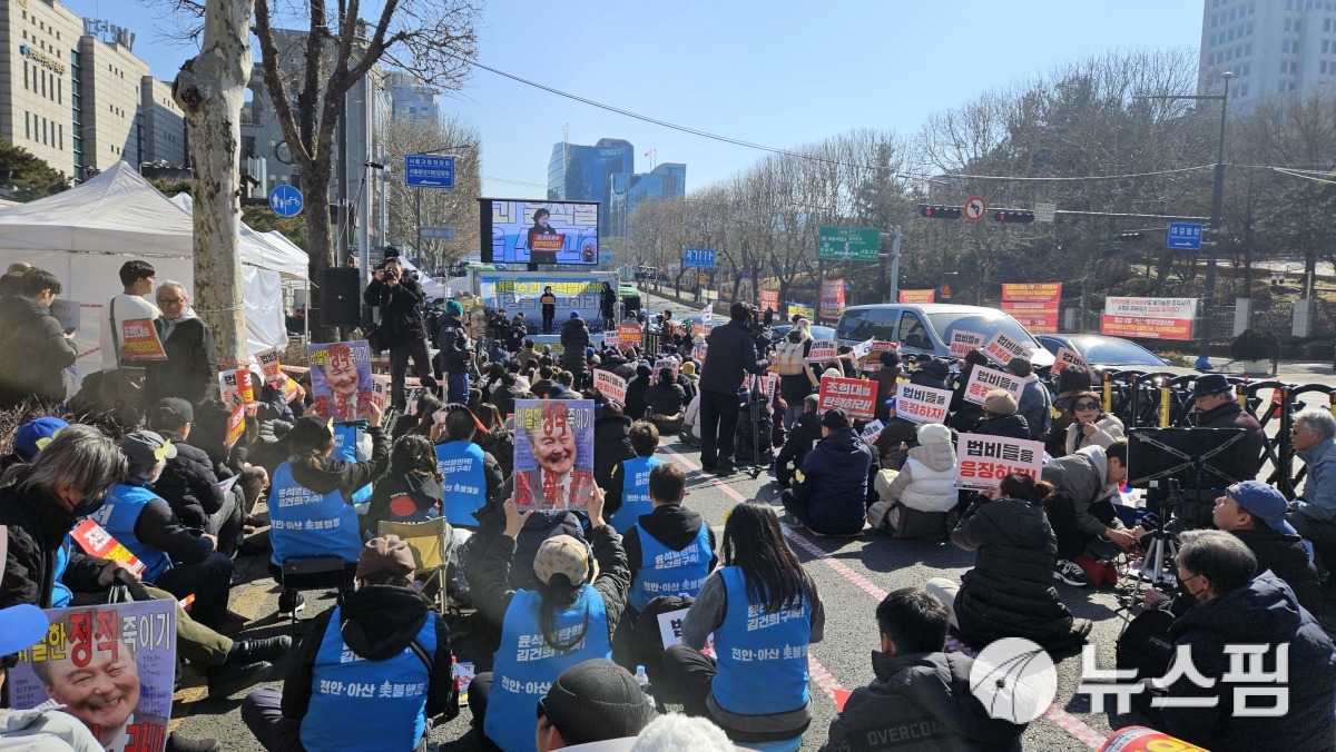 오후 2시부터 시작된 집회는 노래를 제창하고 대표 발언을 이어가는 등 점차 분위기를 끌어 올랐다. 선고 시간이 임박하자 서울중앙지법을 향해 함성을 지르고 구호를 외치는 것으로 선고를 맞이했다.