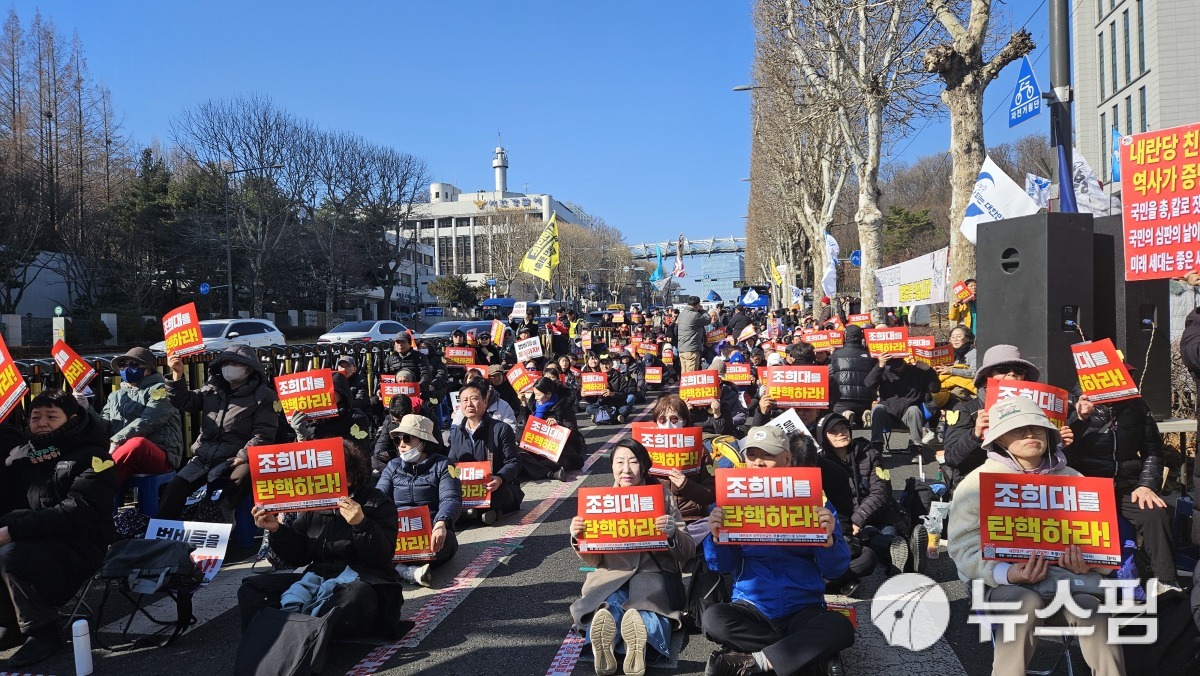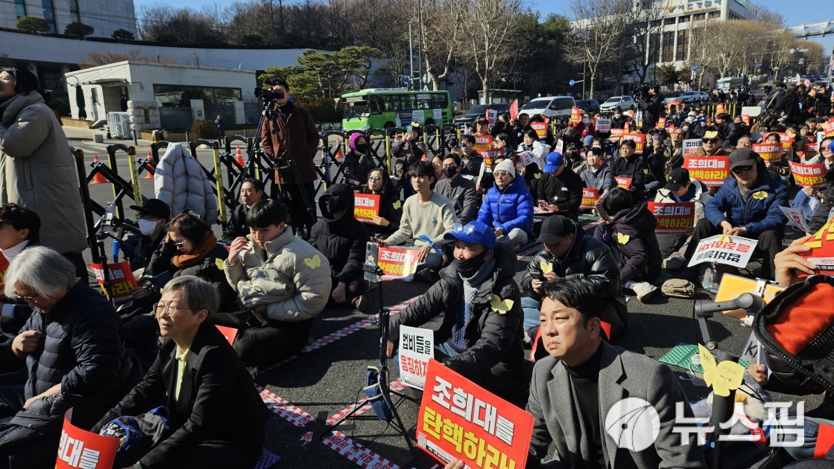 이날 오후 3시 윤 전 대통령의 선고를 앞두고 시민들은 결과를 지켜보기 위해 서울중앙지법 인근에 있는 대검 앞으로 모여 들었다. 설 연휴를 지나며 따뜻해진 날씨에 일부는 반팔만 입고 '내란수괴 윤석열에게 사형을 선고하라', '내란세력 최후보루 조희대를 탄핵하라' 구호를 외쳤다. 집회 주최 측인 시민단체 '촛불행동' 추산 약 3600명이 모였다.